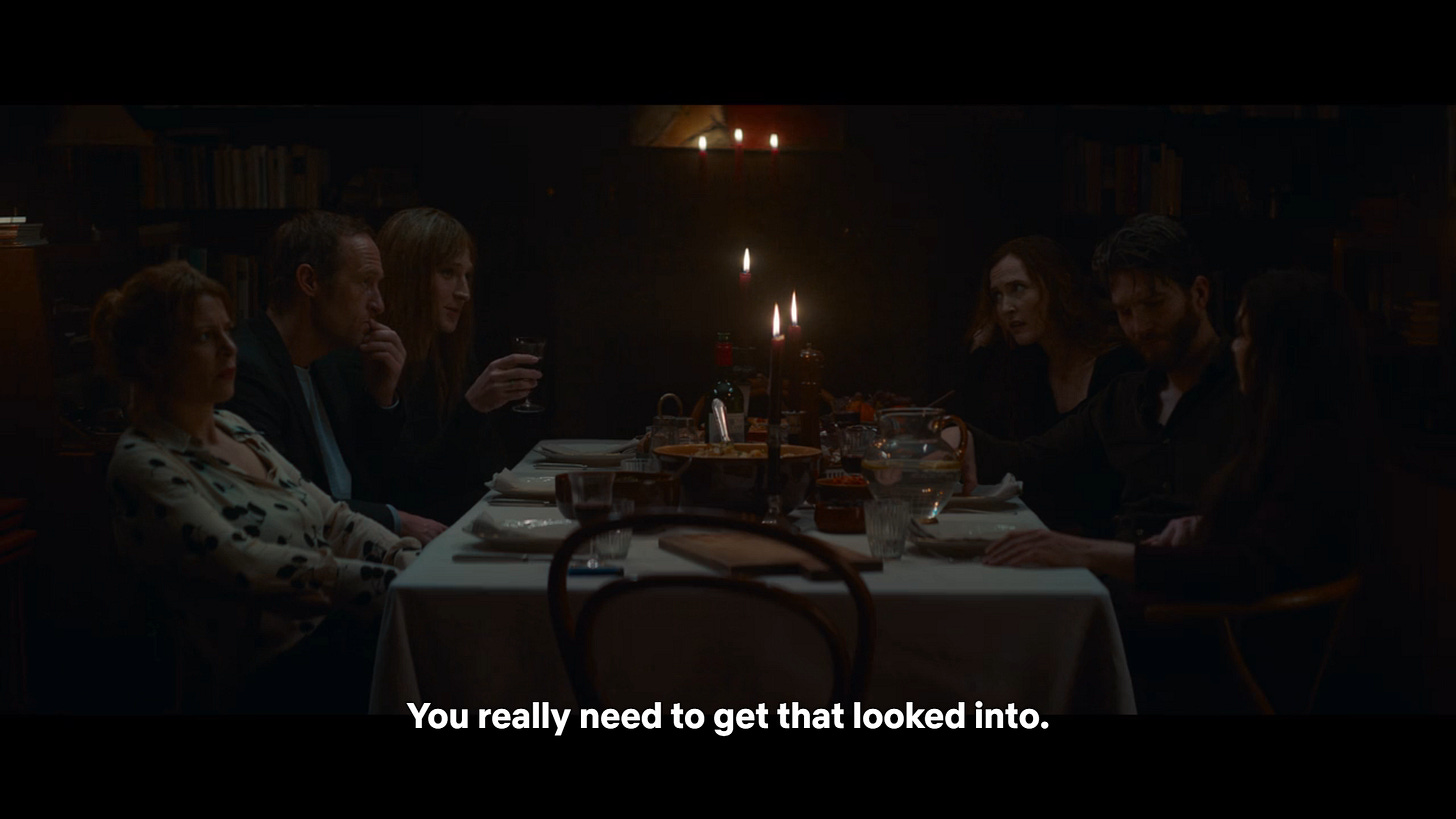 Another woman recommends they toast to a “world without Winden”, who I think is her ex-husband. The power goes back on, and they say they guess Winden isn’t leaving after all and they’re happy it’s back. So maybe Winden is the nuclear power plant? And on that underwhelming note, the episode ends.