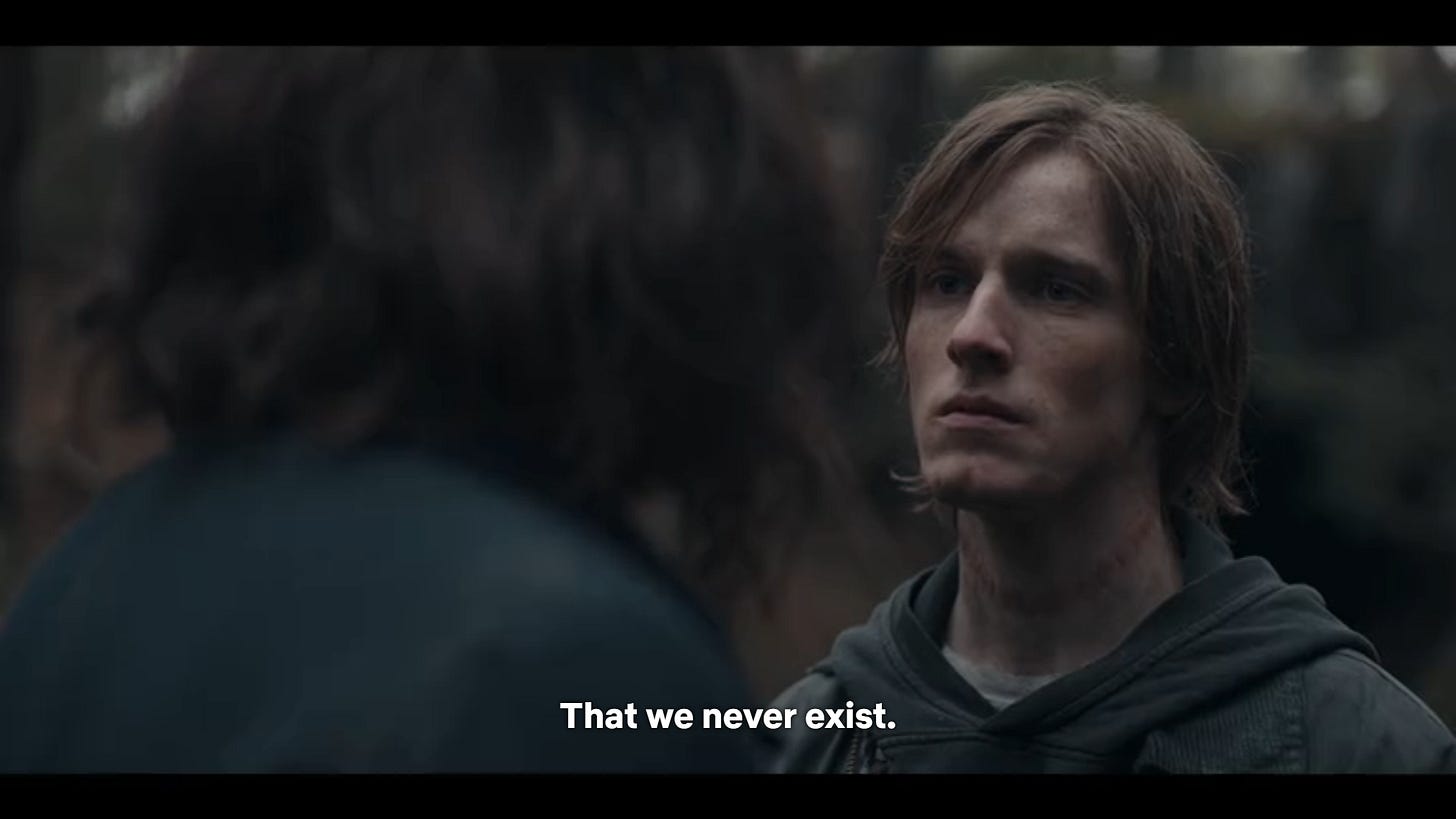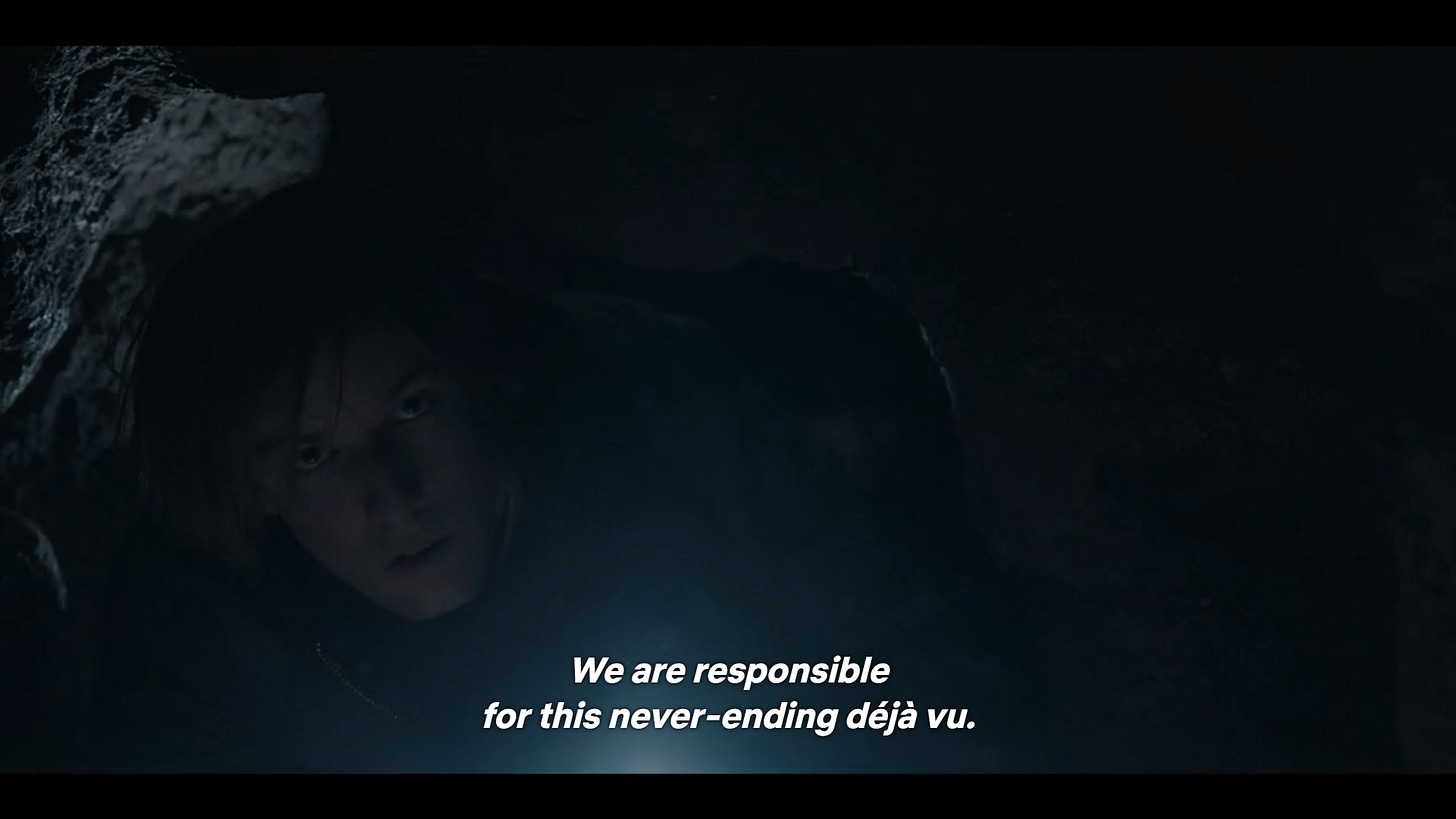 The Witch continues to explain to Scarred Man that there is a loophole, a fraction of a moment during the apocalypse, during which you can change fate and break the time loop. Eva used it to send her younger self in a different direction, and the Witch used it to be here today to talk to Scarred Man. She explains that now Scarred Man needs to use it, to send “Jonas and Martha” in a different direction, because they’re to blame for the time loop.