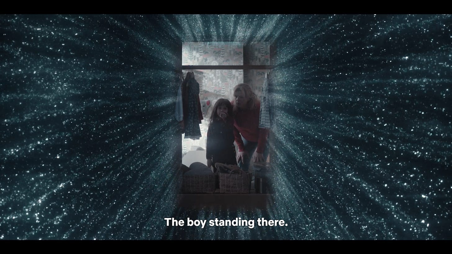 The end of Jonas’s star corridor opens up, and he sees a Young Martha as though from the back of her bedroom closet. She sees him too, but her mother just sees the back of the closet.