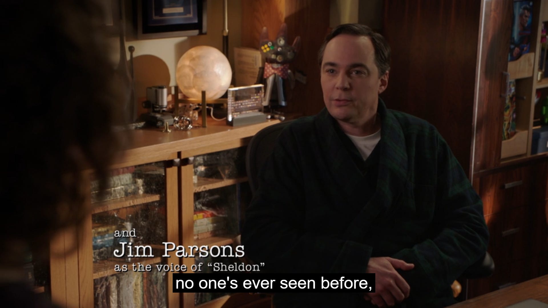 Freeze-frame over the voiceover, as his wife Amy objects. You never do things to make other people happy! Turns out the voiceover is Old Sheldon writing his memoirs. And Jim Parsons as “the voice of ‘Sheldon’” appears in the credits, so I suspect that the memoir framing device is for the whole series, not just this episode.